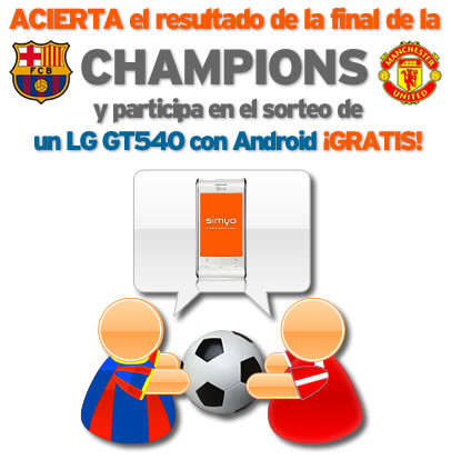 Vuelve la porra de simyo. Este sábado se decide el ganador de la Champions en un partidazo entre FC Barcelona y Manchester United FC y nosotros, para darle más emoción, hemos decidido añadir un Android a la apuesta. Sortearemos un LG GT540 Óptimus con Android entre todos los acertantes del resultado de la Final de la Champions. A ver quién es el campeón que se lleva el móvil! ☺